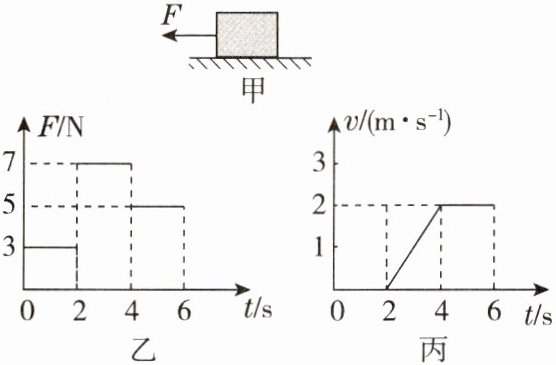 2. [2024·临汾期末] 小梦在水平桌面上用方向不变的力$F$拉木块,如图甲所示。图乙是拉力$F$随时间变化的图像,图丙是木块速度随时间变化的图像,则$0~2\ s$内木块受到的摩擦力为______ N,木块从$2\ s$时开始运动,则$3\ s$时受到的摩擦力是______ N。