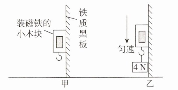 3. [新器材·磁吸木块] [2024·太原阶段练] 如图甲所示,一块中间装有磁铁的小木块吸在竖直的铁质黑板上保持静止,已知它的总质量是$0.2\ kg$,黑板吸引磁铁的力为$15\ N$,则小木块受到的摩擦力为______ N。若在小木块下方挂上$4\ N$的重物后(如图乙),小木块刚好可以沿竖直方向向下做匀速直线运动,则此时木块受到的摩擦力为________ N。($g$取$10\ N/kg$)