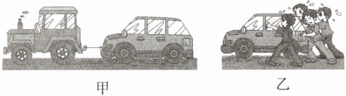 2. 如图甲,用一台拖拉机将陷入泥潭的汽车拉了出来,图乙中一群中学生齐心合力也可以把汽车从泥潭中推出。此时拖拉机对汽车的拉力是同学们对汽车推力的________,其主要的依据是:作用在同一物体,且________________相同。