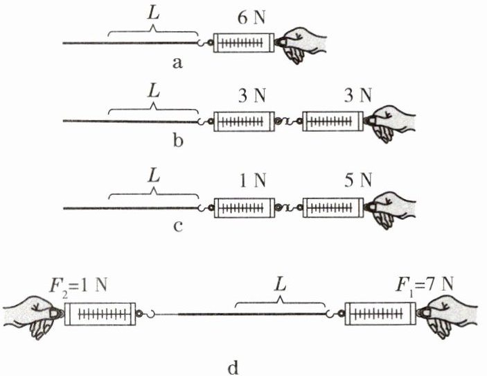 3. (教材改编题)为了研究同一直线上两个力的共同作用效果,某同学利用一根橡皮筋、细线、弹簧测力计等器材进行实验;