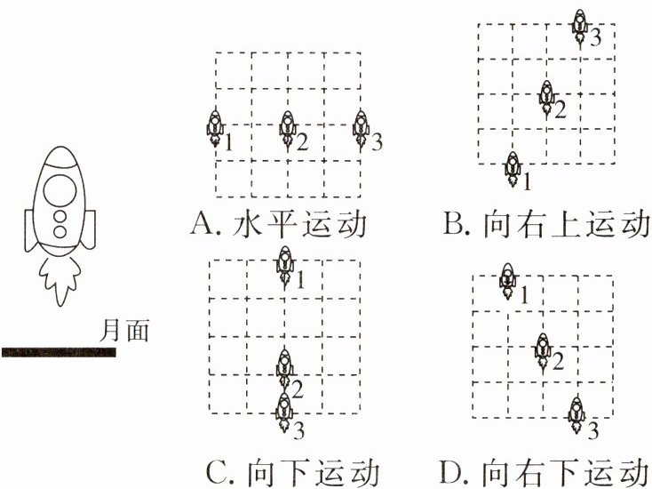 2. 新考法 2024 年 6 月 2 日,“嫦娥六号”探测器在月球背面成功着陆,开启“蟾宫挖宝”。如图,若在月面看到上升器一直竖直向下喷气,且其作用力大小始终与重力相同,相同时间内上升器在空中依次经过了 1、2、3 三个位置。相对于月面,这三个位置分布不可能是 ( )