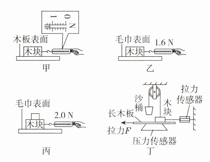 (6)(优化器材)小点用如图丁所示的装置做进一步探究,两个传感器可分别显示拉力和压力的大小。往沙桶中加减沙子的目的是探究滑动摩擦力的大小与______的关系;通过______(填“拉力”或“压力”)传感器的示数可知木块所受摩擦力的大小;实验过程中,______(填“需要”或“不需要”)匀速拉动长木板。
