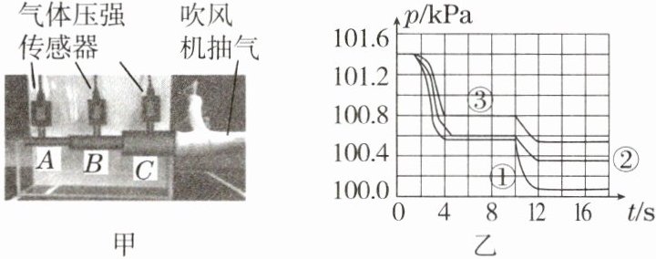 当用吹风机抽气时,三节管子中气体压强随时间变化的情况如图乙所示,则图线①反映的是______(填“A”“B”或“C”)管内气体压强随时间变化的情况。第10 s时,①②③三条图线出现明显下移,由此判断,三节管中气体的流速______(填“增大”或“减小”)。