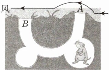 8.(跨学科·生物)如图是草原犬鼠洞穴的横截面示意图。它有两个出口,当风吹过隆起洞口A表面时,风速较大,吹过平坦洞口B时,风速较小,从而给洞中的犬鼠带去凉风。则下列有关洞内风向分析正确的是 ( )