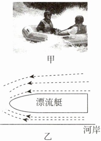 9. [科学推理] 小点和同学一起参加漂流活动,如图甲所示,乘坐漂流艇时,他们发现狭窄区域中水的流速会增加。当他们的漂流艇处于如图乙所示位置时,漂流艇将______(填“靠近”或“远离”)河岸,你的判断依据是______。