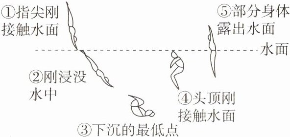 9. 如图表示跳水运动员从入水到露出水面的过程,其中②→③阶段运动员受到水的浮力______,④→⑤阶段运动员受到水的浮力______。(均填“减小”“不变”或“增大”)