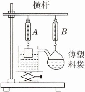 11. 新器材 小沫利用两个相同的弹簧测力计A和B、溢水杯、薄塑料袋(质量忽略不计)等来验证阿基米德原理。如图所示,将装满水的溢水杯放在升降台上,用升降台来调节溢水杯的高度。当逐渐调高升降台时,小沫发现随着金属块浸入水中的体积变大,弹簧测力计A的示数_______,弹簧测力计B的示数_______,且A和B示数的变化量_______。