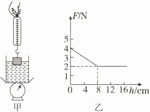 11. [科学思维] 小明利用如图甲所示的装置,将物块从水面缓缓浸入水中,图乙为弹簧测力计的示数 $F$ 与物块浸入水中深度 $h$ 的关系图像,物块浸没在水中时所受的浮力为 ________ N,台秤的示数将增加 ________ g。($g$ 取 10 N/kg)