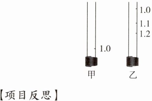 (2)将密度计放入水中,待稳定后用记号笔在液面平齐处标出刻度“1.0”,如图甲所示。小组成员发现“1.0”刻度在吸管的中下部位置,根据项目目的要将刻度“1.0”上移,请提供一种可行的措施:______________(写一条即可);经改进后,再将密度计依次放入水、密度为1.1 g/cm³的食盐水、密度为1.2 g/cm³的食盐水中,待稳定后用记号笔分别在液面平齐处标出刻度“1.0、1.1、1.2”,如图乙所示;