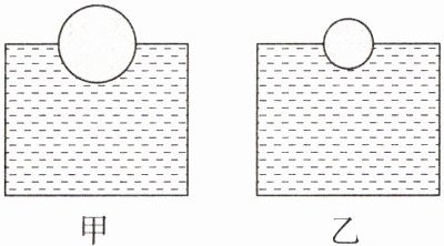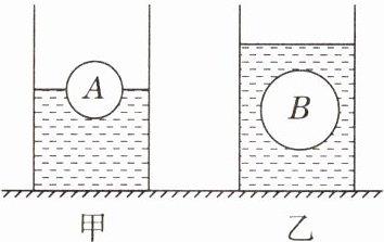 8. 如图,水平桌面上两个相同的长方体玻璃缸装满了水,水中分别漂浮着大、小两只球。两只球受到的浮力分别为$F_{甲}$和$F_{乙}$,根据______(填“A”或“B”)可知,$F_{甲}$_______$F_{乙}$。