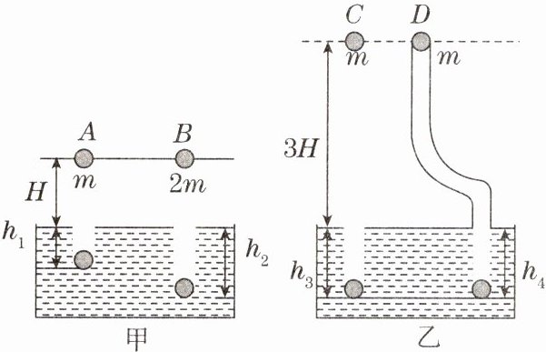 为了验证猜想,他们准备了如下实验器材:花泥(易产生塑性形变)若干块,刻度尺一把,体积相同、质量为m的小球3个和质量为2m的小球1个、光滑管道1根等。所用实验装置如图甲、乙所示(图乙中,小球在光滑管道中运动的能量损失不计)。实验中均让小球从图中高度自由下落,待小球静止后,分别用刻度尺测出小球陷入花泥的深度。请你根据图中实验情景完成下列内容: