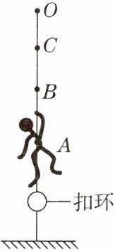 9. 如图所示,弹性轻绳的上端固定在O点,拉长后将下端固定在人的身上,并与固定在地面上的扣环相连。打开扣环,人从A点由静止释放,像火箭一样被“竖直发射”,能上升到最高位置C点,在B点时速度最大。对此过程,下列描述正确的是( )