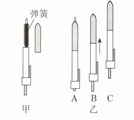 13. (新情境题)将圆珠笔笔尖朝上按下后放手,它会弹很高。拆开后发现它内部有一根弹簧,如图甲。小明发现,圆珠笔弹起的过程可分为“A.按下后放手”,“B.获得一个向上的速度”,“C.向上运动到最高点”,如图乙。笔在“A→B”阶段,________转化为动能;笔在“B→C”阶段,动能转化为________。