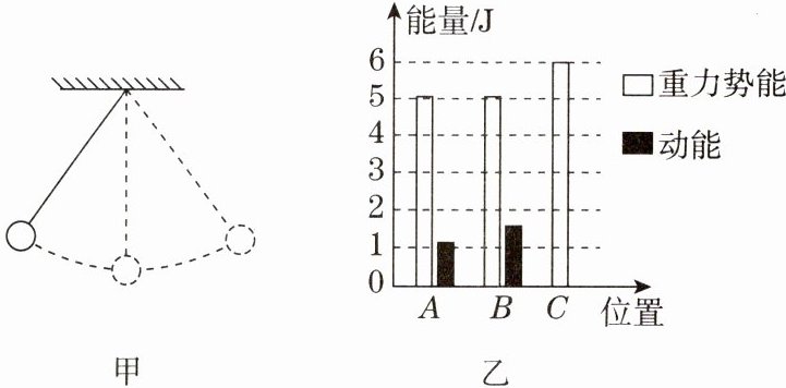 11. 新考法 [2024·大同期末]荡秋千是中小学生喜欢的游戏,如图甲为荡秋千的简化模型。小球经过A、B、C三点的能量如图乙所示,下列说法正确的是( )