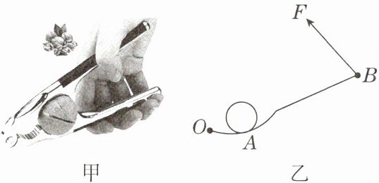 5. 核桃夹是一种帮助人们轻松撬开核桃的工具,如图甲所示。我们可将核桃夹看作以O点为支点的两根杠杆,其中一根杠杆OAB的简图如图乙所示,请画出手在B点处施加动力F的力臂l。
