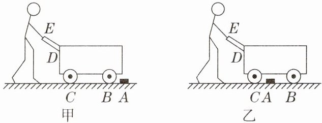 11. 如图甲所示,高铁上的餐车前轮遇到障碍物A时,应该________(填“抬起”或“按压”)扶把E,这时餐车可以看作杠杆,支点是C;如图乙所示,当后轮遇到障碍物时,应该________(填“抬起”或“按压”)扶把E,此时支点是________。