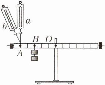 13. [科学推理]在图中,挂在B点的两个相同的钩码重力均为0.5 N。当弹簧测力计在A点沿竖直方向的a方向拉时,杠杆平衡。这时弹簧测力计的示数$F_a$ = ________N。若弹簧测力计沿斜向上的b方向拉时杠杆仍然平衡,则弹簧测力计的示数$F_b$ ______(填“>”“=”或“<”)$F_a$,其原因是________________________。