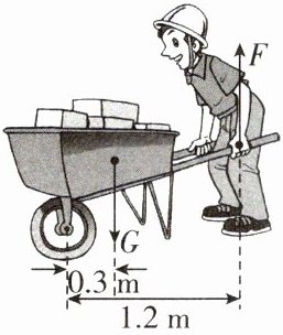 4. 如图所示的是搬运砖头的独轮车,车箱和砖头的总重G = 1 200 N,独轮车的有关尺寸如图所示。推车时,人手竖直向上的力F应为____N。