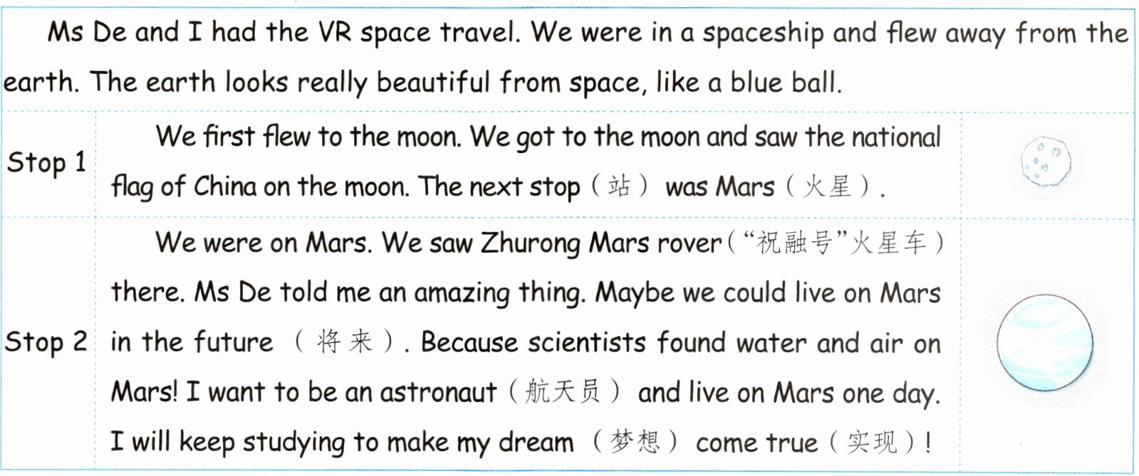 - 梦梦和 Ms De 参加了学校 VR 社组织的太空旅行,阅读梦梦的太空日志,完成下列任务。