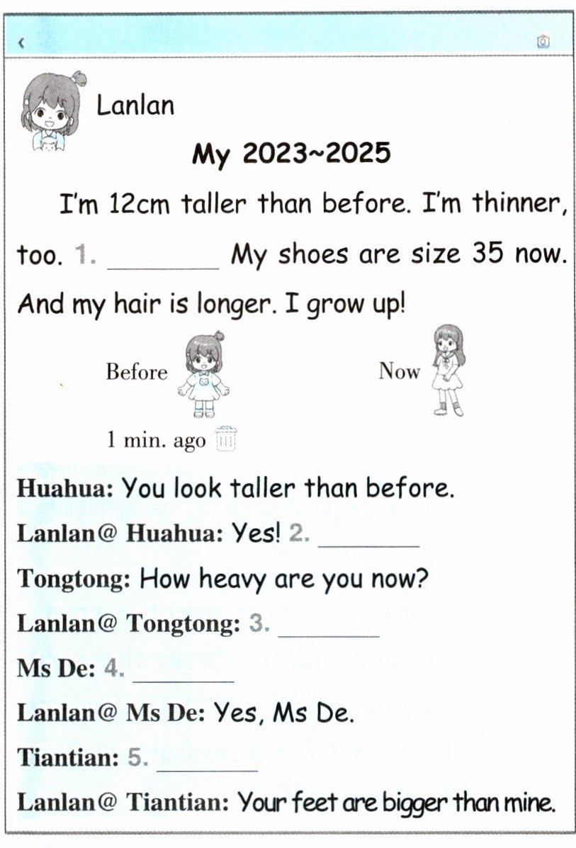 主题情境:照片对比个人变化 今天,Lanlan 发了一个朋友圈。看看她的朋友圈,完成下列任务。