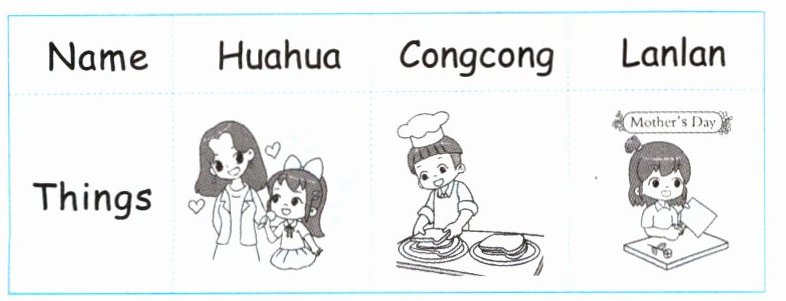 Diandian统计了朋友们母亲节将要为母亲做的事情。根据统计表补全下面对话。