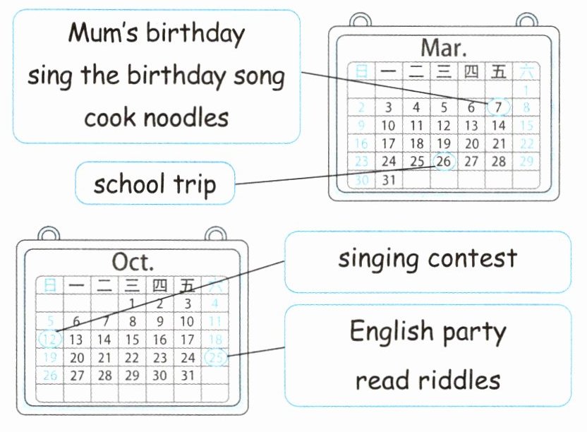观察Diandian三月和十月的活动日历,完成下列对话。