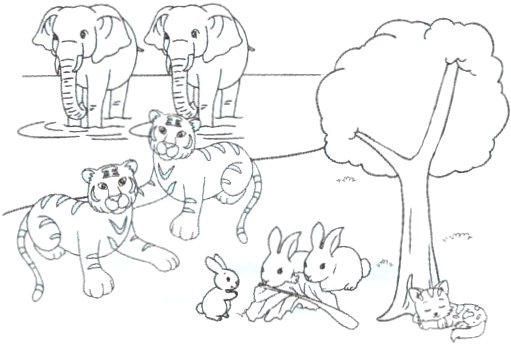 Look! The monkey is 1.________ a tree. The bear is 2.________ with a ball. The rabbit is 3.________. Two pandas are 4.________ bamboo. The elephants are 5.________ water. The tiger is 6.________. What lovely animals!