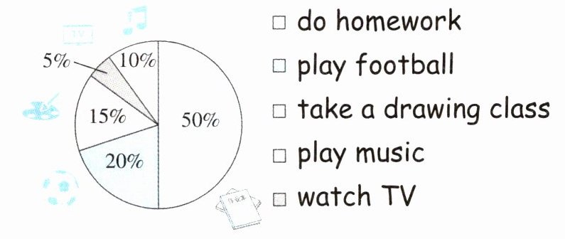 There are forty students in our class. This is a chart about our weekend activities. On the weekend, twenty students 1. ____________.They are hard−working. Eight students 2. __________________. Playing sports is good for us. Six students 3. ____________________.Four students 4. ________________. Only 5. ______________ students watch TV.