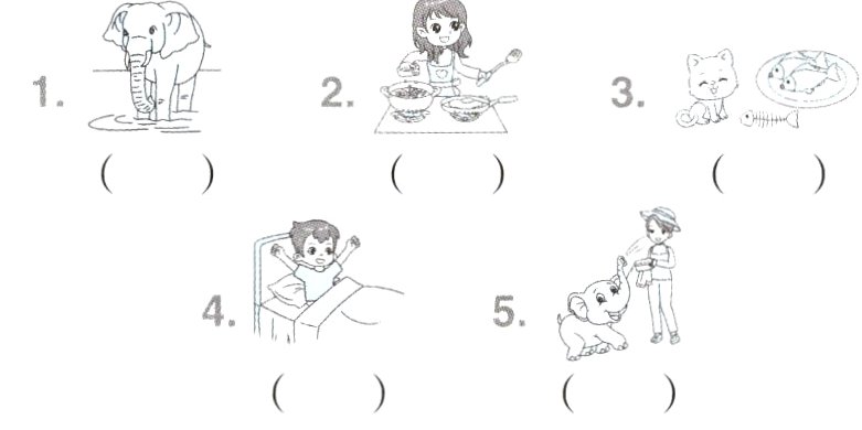 ( )4. A. He is eating bread. B. She's jumping. C. They're sleeping.
