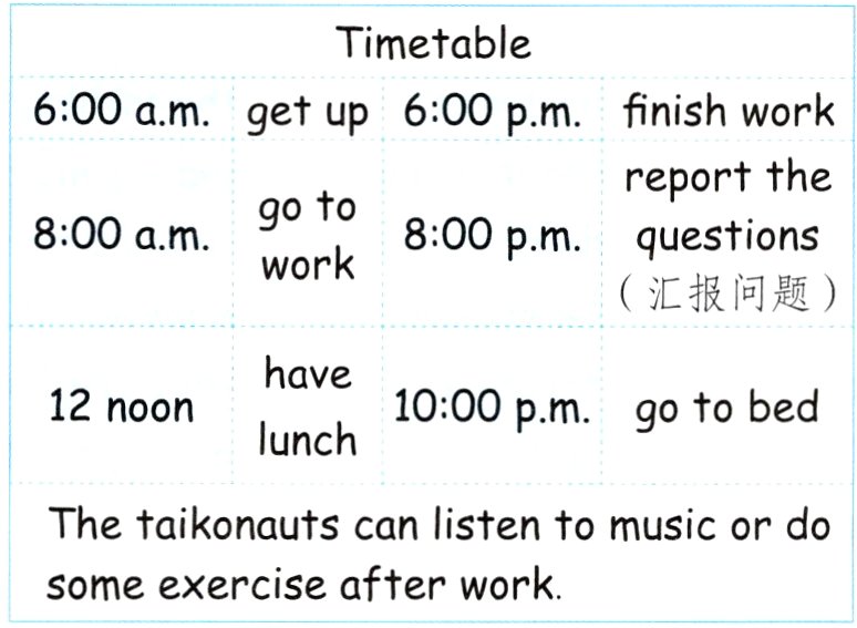5. Yes, they can. [点拨]根据原文“The taikonauts can listen to music or do some exercise after work.”“6:00 p.m. finish work”和“10:00 p.m. go to bed”可知晚上9点他们可以听音乐。