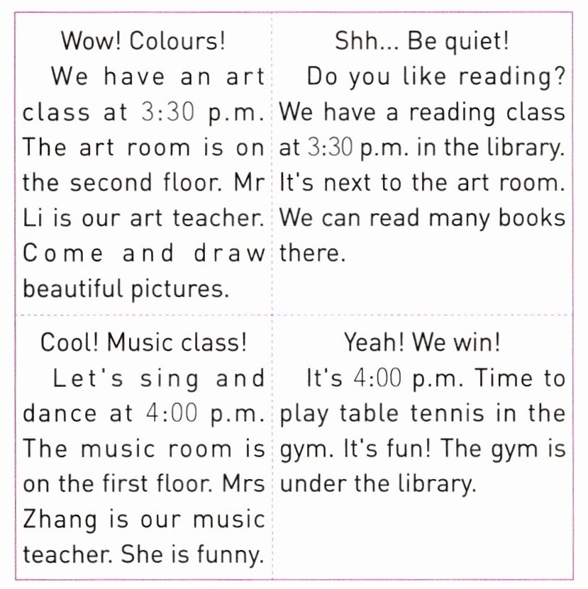B@@A 【点拨】根据题干中的“3:30 p.m.”寻找与之相关的信息。由“We have an art class at 3:30 p.m.”和“We have a reading class at 3:30 p.m. in the library.”可知下午三点半有美术课和阅读课,故选 A。@@B@@C 【点拨】根据题干中的“in the gym at 4:00 p.m.”寻找与之相关的信息。由“It's 4:00 p.m. Time to play table tennis in the gym.”可知下午四点可以在体育馆打乒乓球,故选 C。