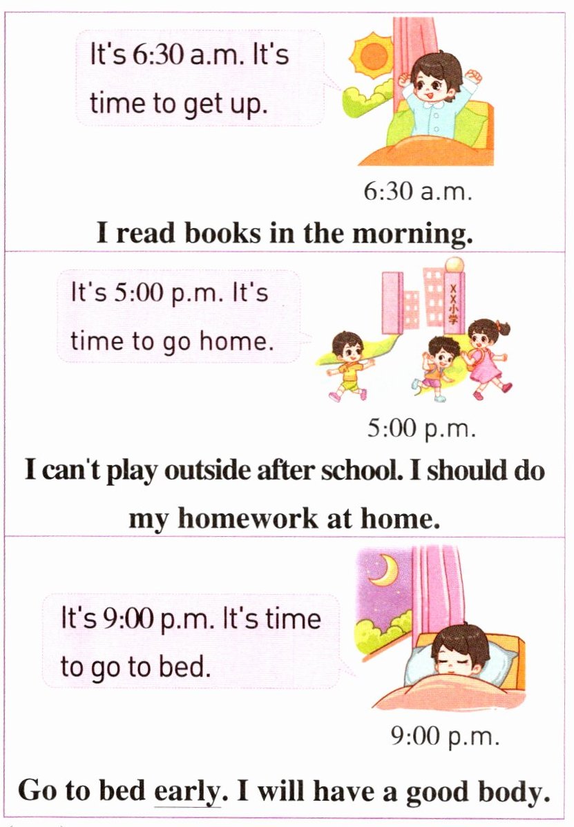 B 【点拨】根据 "It's 6:30 a.m. It's time to get up." 可知 Tom 6:30 起床。@@B 【点拨】根据 "It's 5:00 p.m. It's time to go home." 可知下午五点该回家了。@@A 【点拨】根据常识可知早点睡觉我们会有一个好身体,故 early 意为 “早”。@@C 【点拨】根据 "I read books in the morning." 及 "I can't play outside after school. I should do my homework at home." 可知 Tom 早上读书,放学后不在外面玩,而是回家做作业。故可推测出他是一个勤奋的男孩。