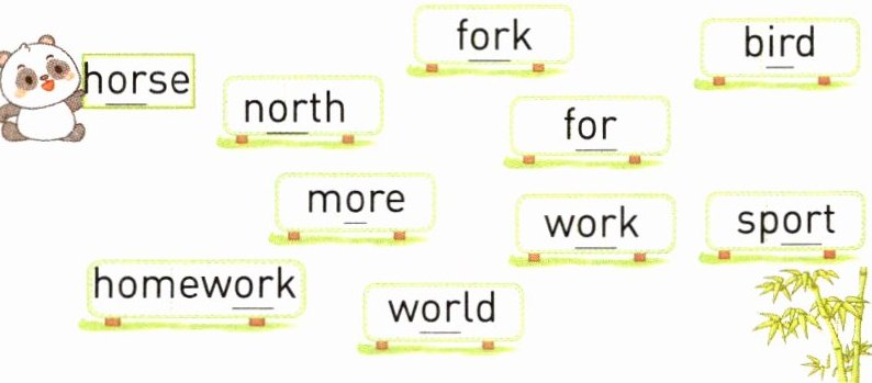 一 找出含有与熊猫手里的画线部分相同发音的单词并写到横线上。