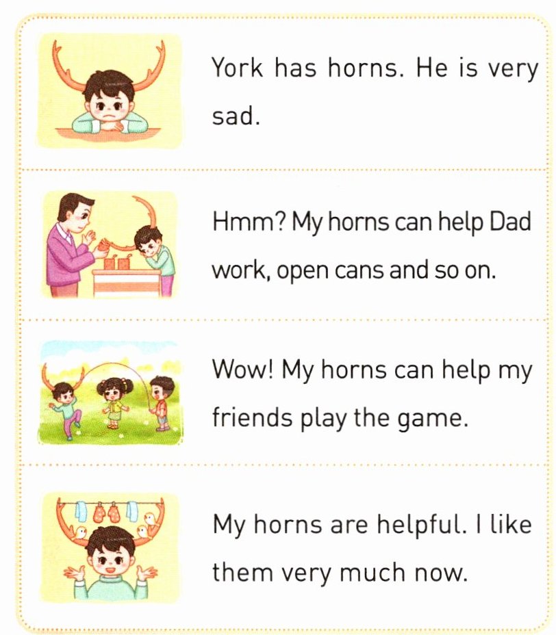 York, horns@@work@@F 【点拨】根据“York has horns. He is very sad.”可知 York 最初是伤心的,故答案为 F。@@F 【点拨】根据“My horns can help Dad work, open cans and so on.”可知 York 的角能帮助爸爸工作、开罐头等,故答案为 F。@@T 【点拨】根据“My horns are helpful. I like them very much now.”可知 York 的角很有用,他现在很喜欢,故答案为 T。@@T