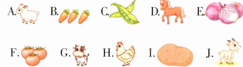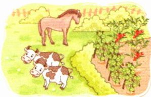 Today is rainy and cold. I can't go out to play. So I draw a picture of a farm at home. In the picture, you can see two 1.________ and a strong 2.________. You can see a vegetable garden, too. There are some big 3.________ and long 4.________ in it. Do you like my picture?