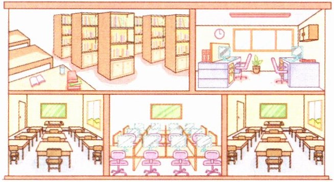 This is my school. It's so 1. ________. This is my classroom. There are 2. ________ students in my class. We have a new 3. ________. It's next to my classroom. I like reading books in it. We have a 4. ________ too. It's on the 5. ________ floor. Do you like playing on the computer? Welcome to my class.
