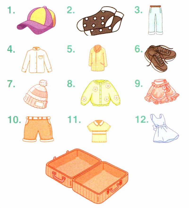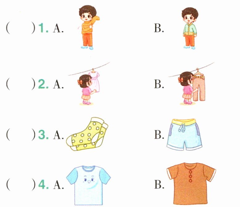 [四 听对话,选出Amy的服饰,将序号填在行李箱内。