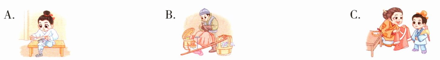B 【点拨】根据“A man from the State of Zheng wants to buy shoes.”可知男人想去买鞋。@@C 【点拨】根据“He first measures (测量) the length (长度) of his feet and makes a ruler.”可知他量了他脚的长度去制作尺子。@@C 【点拨】根据“‘I leave my shoe size (尺码) at home. I’m going home to get the ruler.’”可知他将鞋子的尺寸留在了家里,他要回家去拿尺子。@@C 【点拨】根据故事描述可知男人只肯相信尺子而不愿相信自己的脚。@@A 【点拨】根据“He first measures (测量) the length (长度) of his feet and makes a ruler.”可知他量了他脚的长度去制作尺子,与A图意图相符。