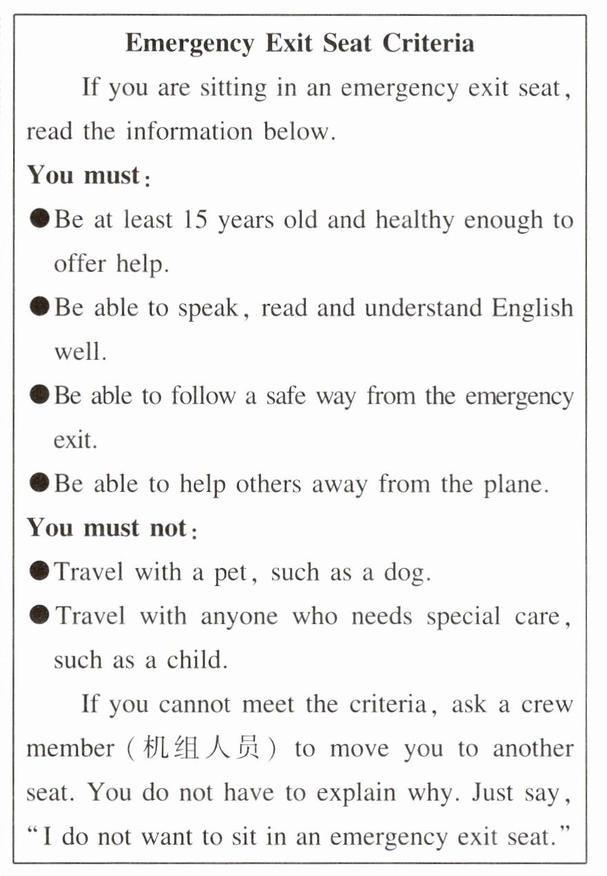 [语篇解读] 本文讲的是和飞机紧急出口座位有关的一些标准。