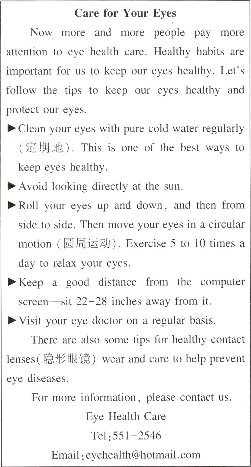 23.D 细节理解题。根据“Clean your eyes with pure cold water regularly. This is one of the best ways to keep eyes healthy.”可知,定期用纯净的冷水洗眼睛是保持眼睛健康的最好方法之一,故选D。