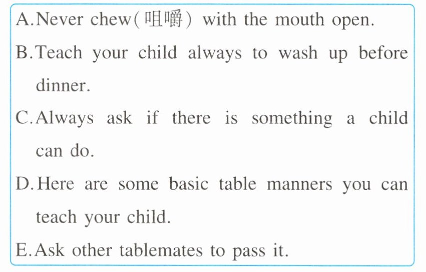 22. A 根据其后提到的“Chewing with the mouth closed”可知,所缺的句子是 A。