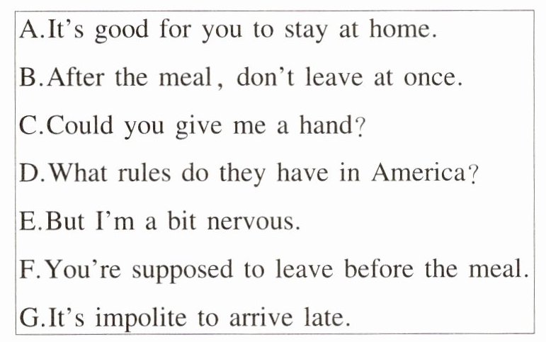 A:____50 If you leave as soon as you finish eating, you seem to come only for the meal. When your friends seem to be getting tired and running out of things, it’s time to leave. The next day, call or write a thank - you note to say how much you enjoyed the meal.