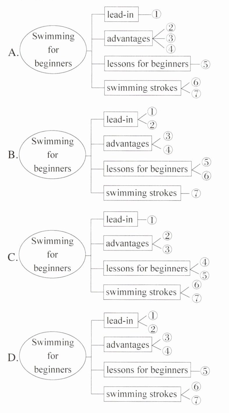 3.C 文章结构题。本文开头第一段引出话题;第二段和第三段介绍了游泳的好处;第四段和第五段介绍了初学者的游泳课程;第六段和第七段介绍了游泳姿势。故对应的结构是C。