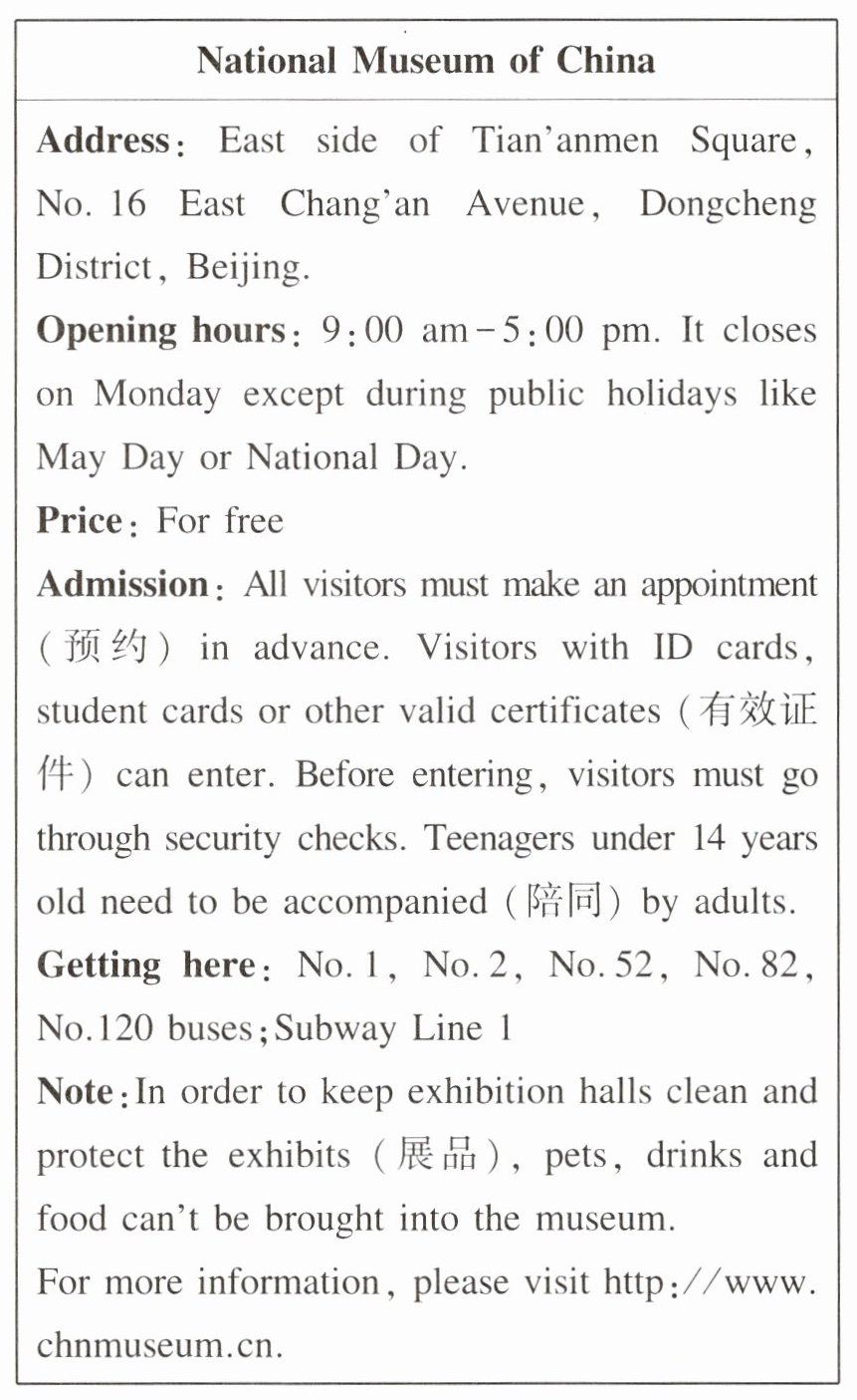 Mrs Li plans to visit the National Museum of China next Sunday with her son. She is looking for some information on its official website.