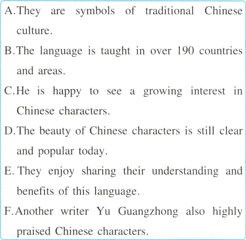 32. F 设空处前提到了鲁迅对汉字的看法,此处所缺的句子是 F,该句的含义是“另一位作家余光中也高度赞扬了汉字”。
