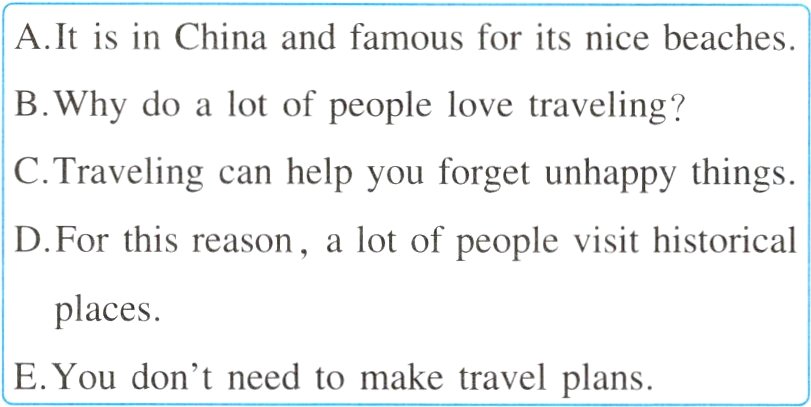 31.B 根据设空处后的“这儿有一些去旅游的很好的原因”,所缺的句子是 B。 32.E 设空处后提到了“你也不需要订票”可知,所缺的句子是 E。 33.C 通读本段可知,本段讲的是“旅游可以帮助你忘记不开心的事情”,所缺的句子是 C。 34.D 本段讲的是“旅游可以给你一个了解世界的机会”,根据设空处后提到的 cultural tourism 可知,所缺的句子是 D。 35.A 根据设空处前提到的“你还可以去三亚”可知,所缺的句子是 A。