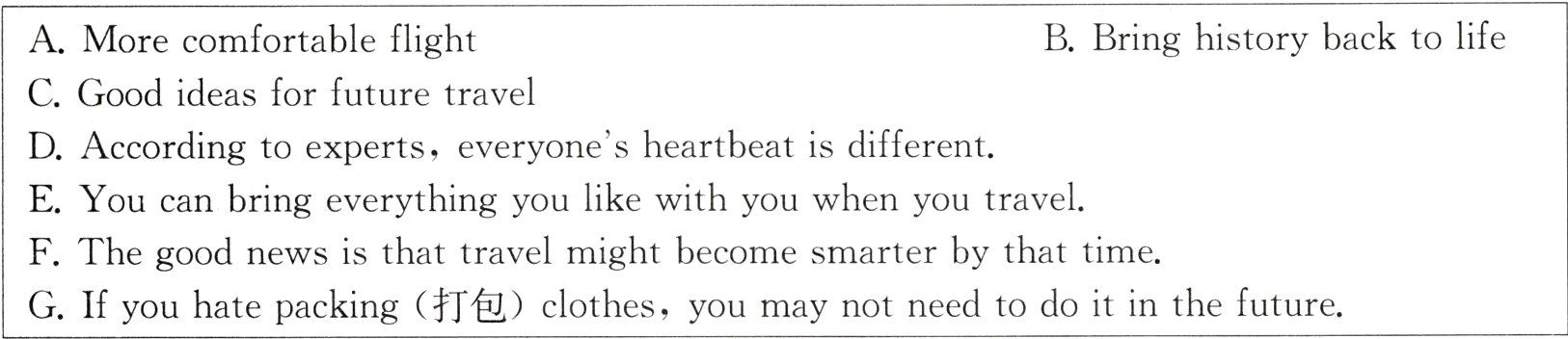 4. ________ Before you fly, you will have a body scan (扫描). When you arrive, you can find 3-D printed clothes in your size. When you leave, the clothes can be recycled and reprinted for the next person. You can also 3-D print whatever you want to eat.