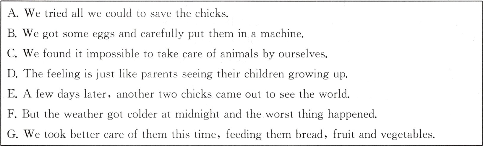 I couldn’t help smiling when I saw the birth of two baby chicks. We thought the weather outside was warm, so we put them in a box outside. We used a blanket to keep them warm. 2. _________ They both died. All of us felt very sad when we saw this. Our Biology teacher said, “Life is fragile(脆弱的). We should cherish(珍惜)the chance to live.”