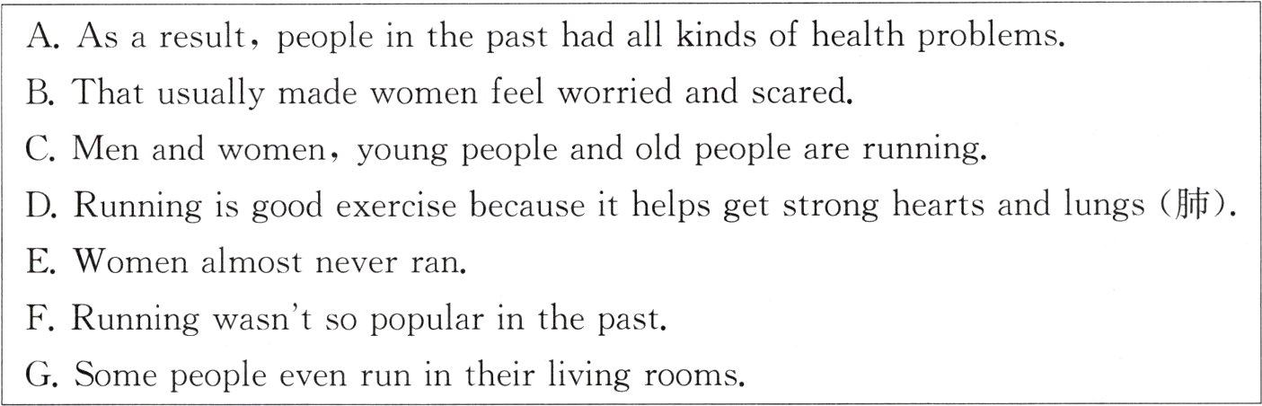 Early in the morning, at noon or in the evening, in big cities and in the countryside all across the United States, you can see Americans running. 1._______ People run everywhere — along the beaches, through the park, down quiet streets or at the gym (体育馆). 2._______