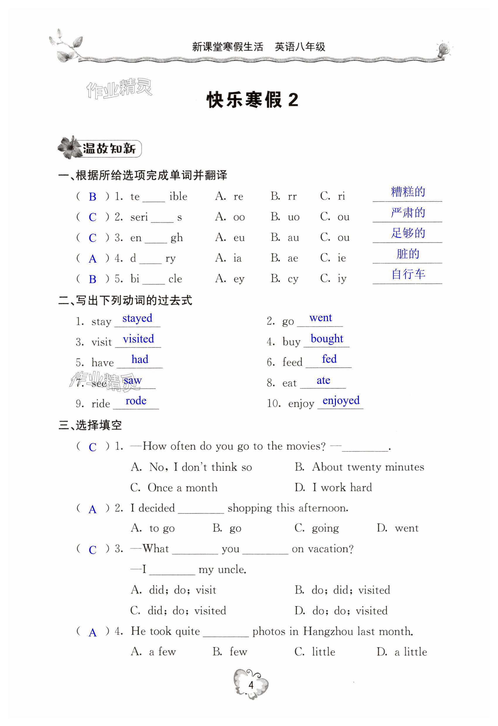 注:目前有些书本章节名称可能整理的还不是很完善,但都是按照顺序排列的,请同学们按照顺序仔细查找。练习册 2025年新课堂寒假生活八年级英语人教版 答案主要是用来给同学们做完题方便对答案用的,请勿直接抄袭。